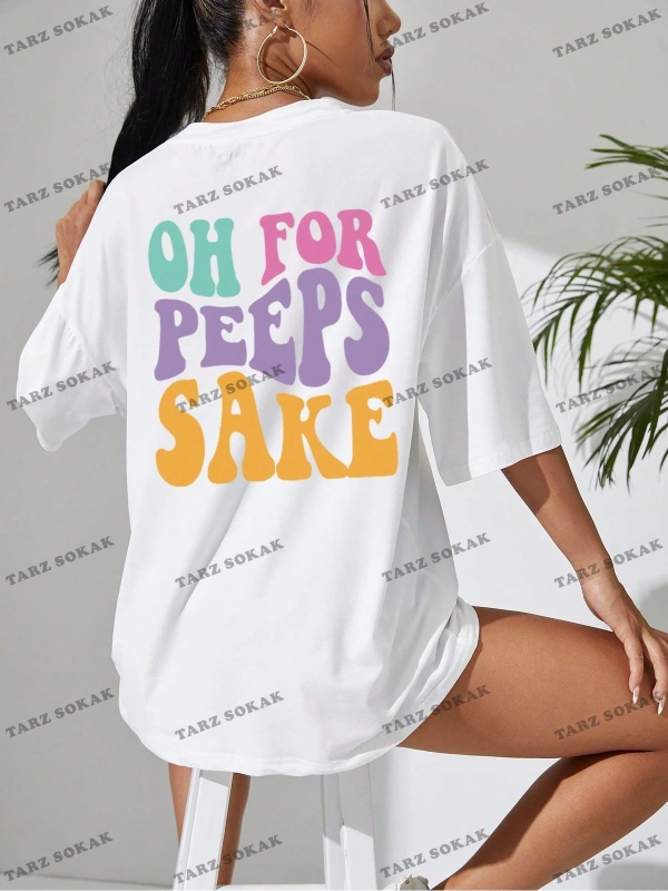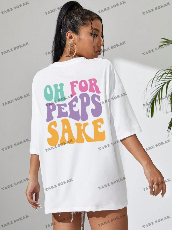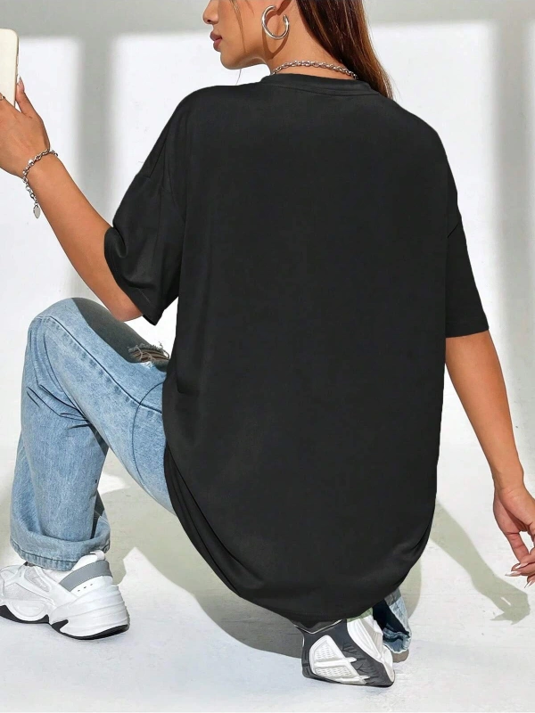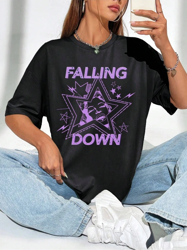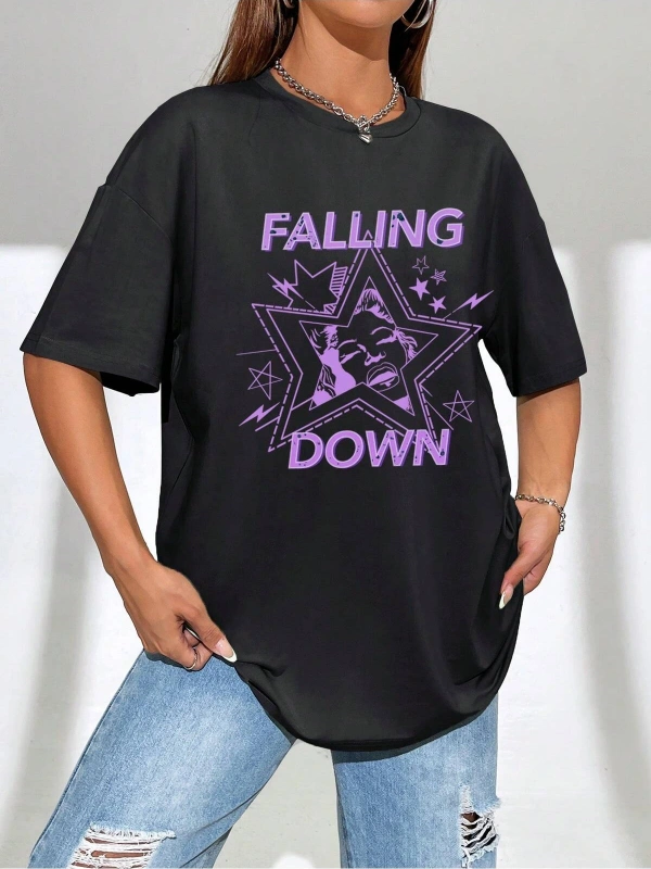 Figür ve Slogan Grafikli Düşük Omuzlu Tişört