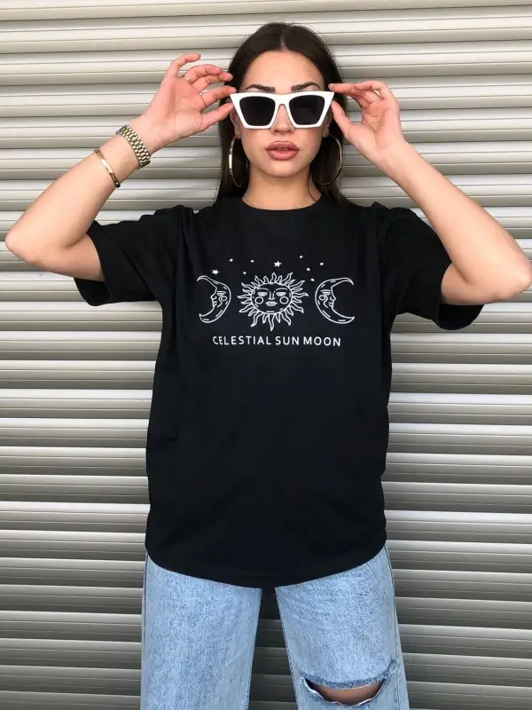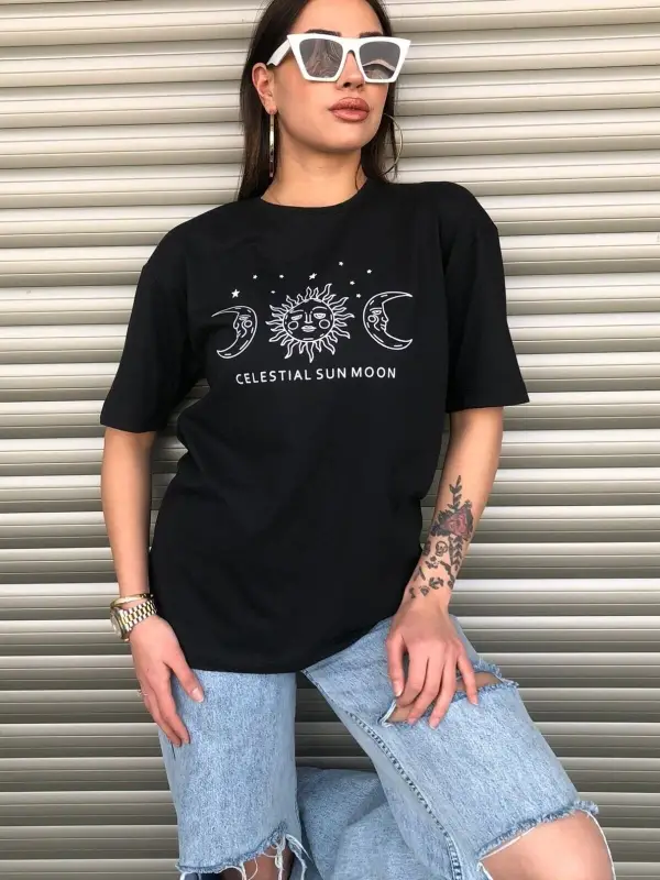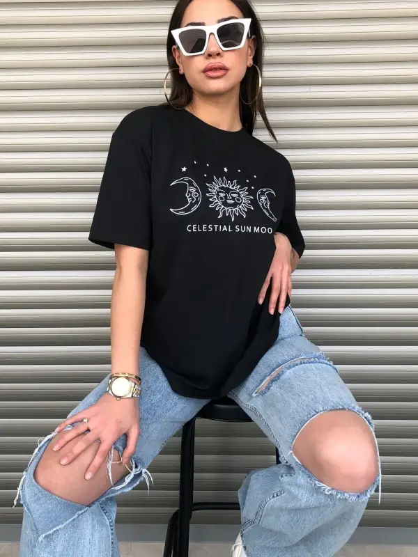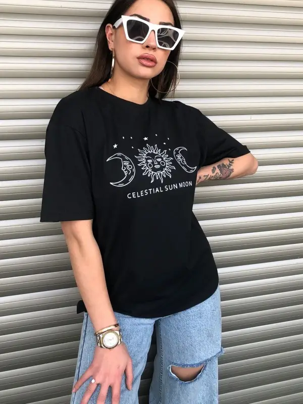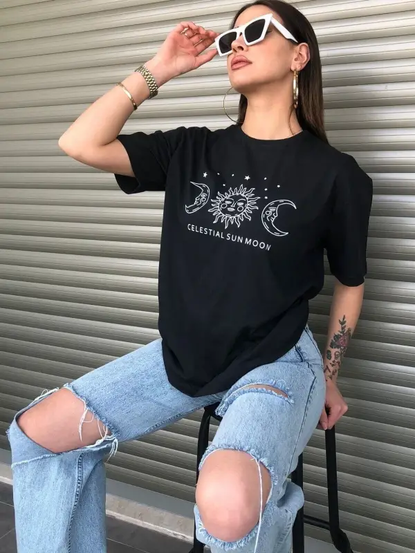 Bisiklet Yaka Siyah Ay Baskılı Oversize
