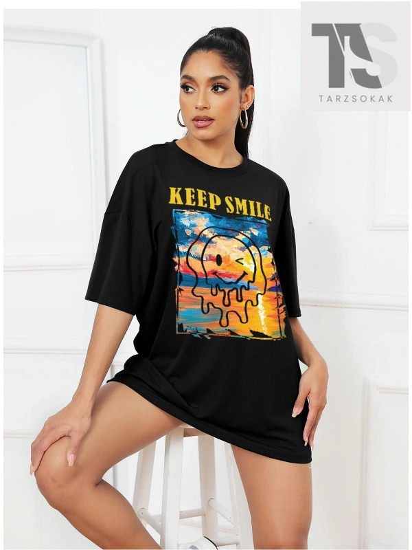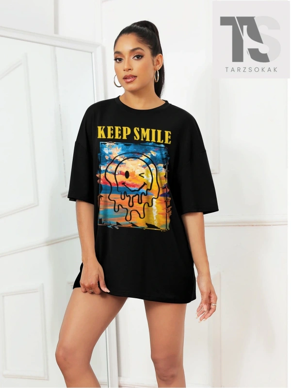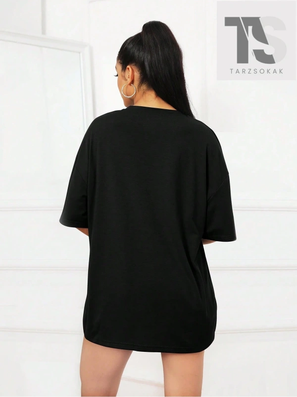 Harfli ve Grafikli Düşük Omuzlu Oversize Tişört