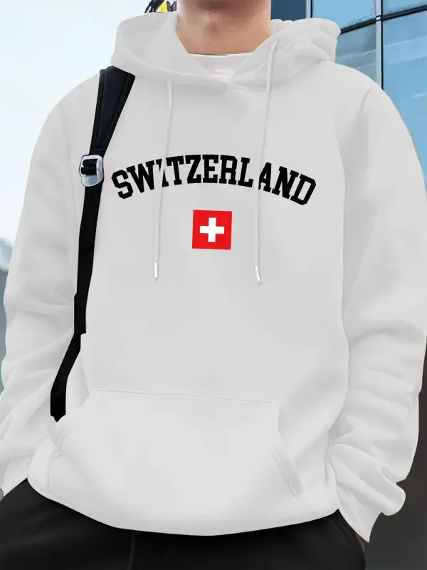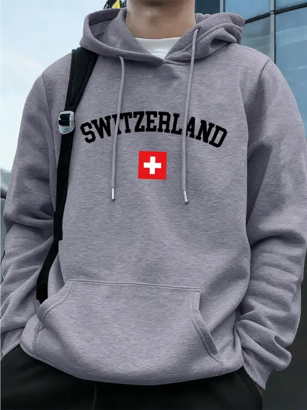 İsviçre Bayrağı Baskılı Erkek Kapüşonlu Üstleri Sonbahar Cepli Sweatshirtler Temel Polar Sıca