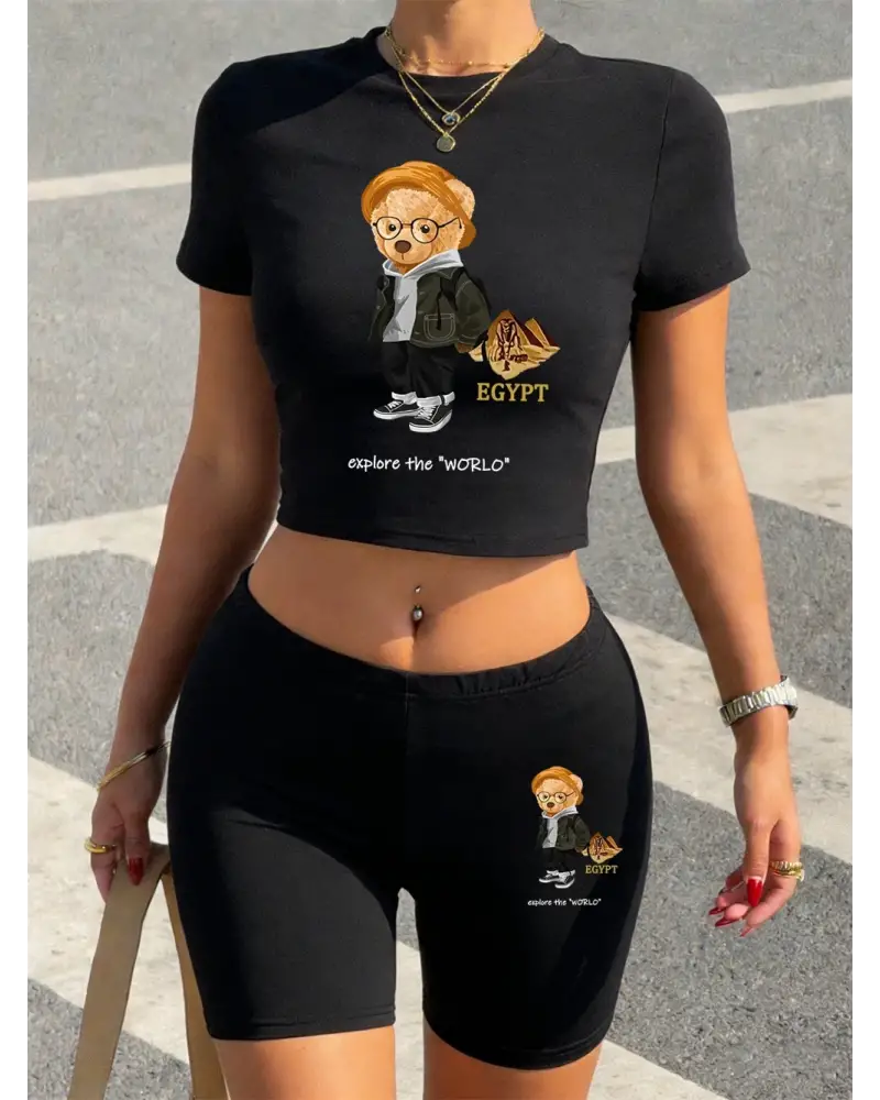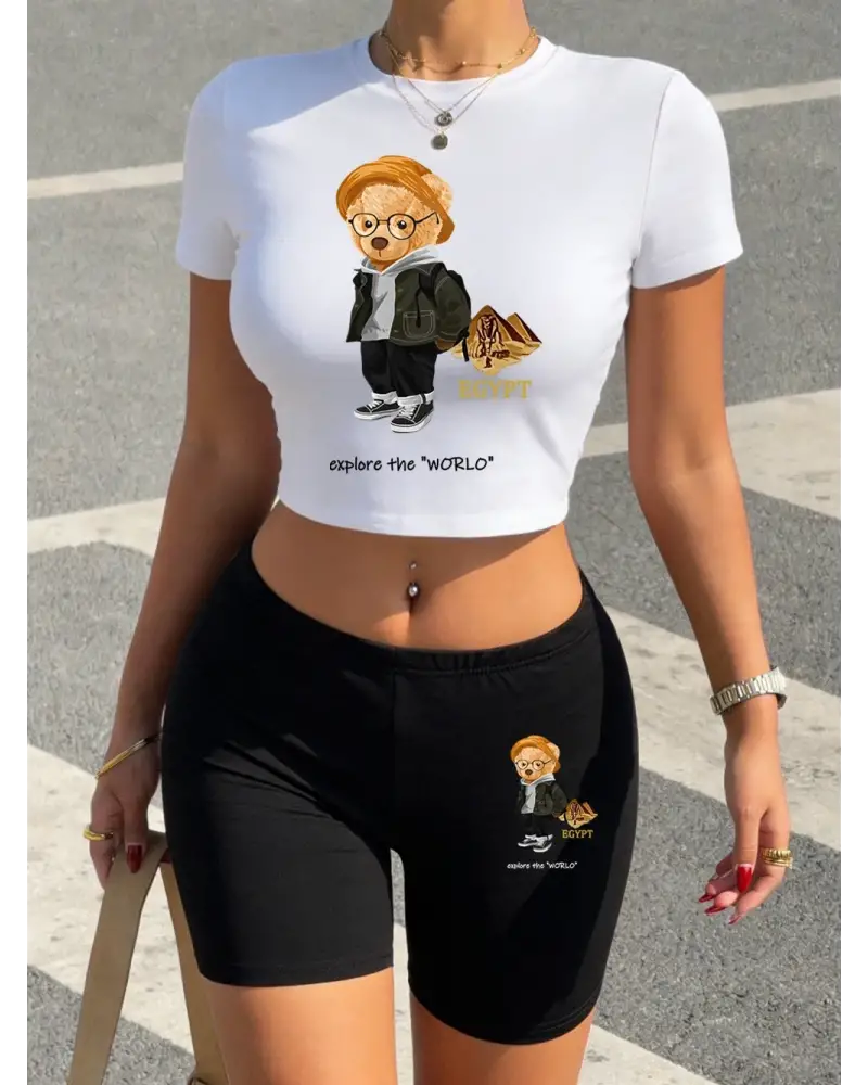 Yaz Ayısı Dünyayı Keşfedin Baskılı Babby Tees Şort Kadın Seksi İki Parçalı Set Tişörtler Yükse kaliteli malzeme ve konforlu kullanım sunan bir üründür. Günlük kullanım için ideal olup uygun fiyat ve hızlı kargo avantajıyla sunulmaktadır.