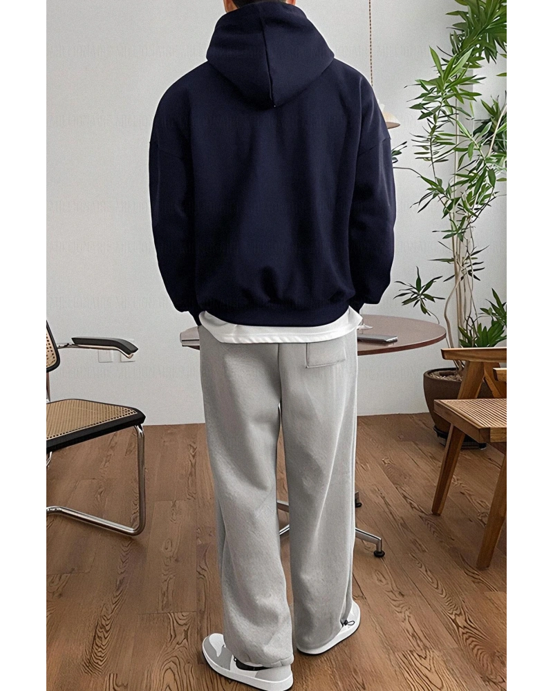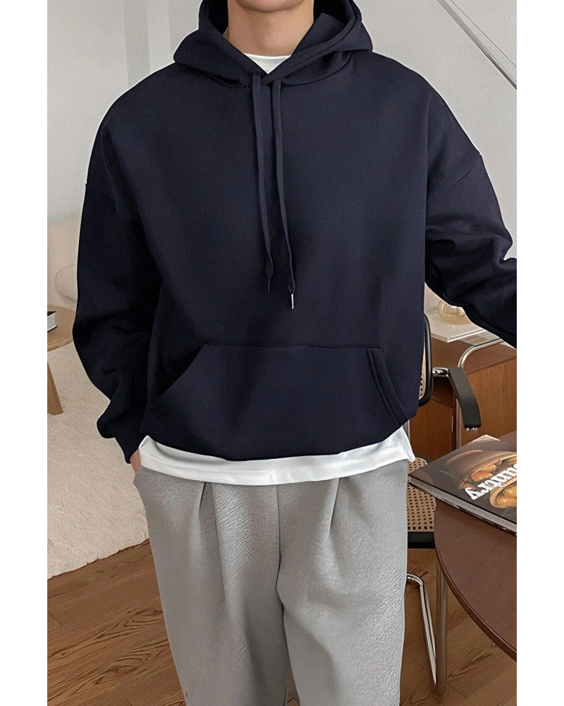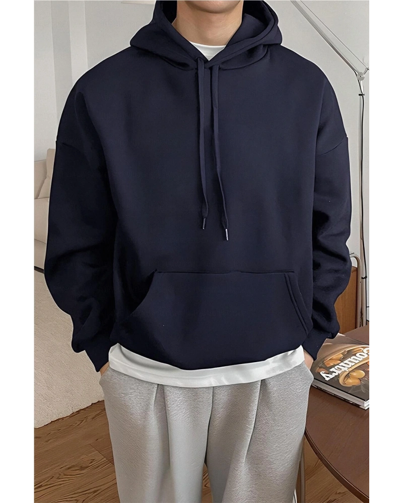 Erkek Lacivert Düz Kapüşonlu Oversize 3 iplik Şardonlu Salaş Bol Kesim Hoodie Swe Lacivert