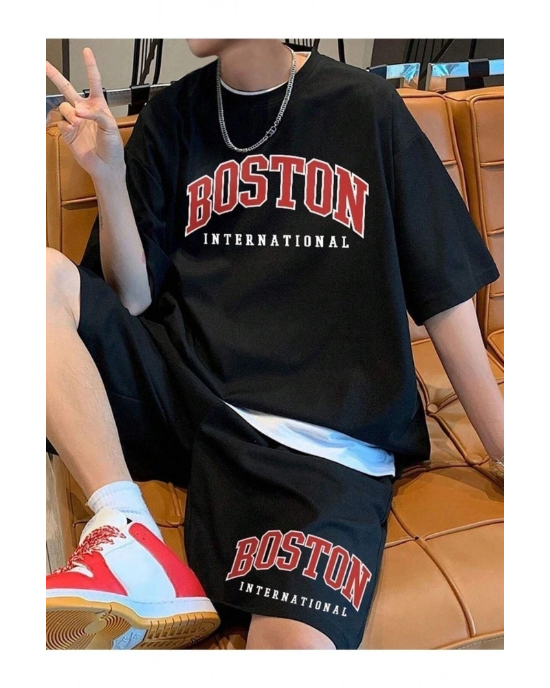 Erkek Siyah Boston International Baskılı Oversize Şortlu Takım Tw-bstontakims