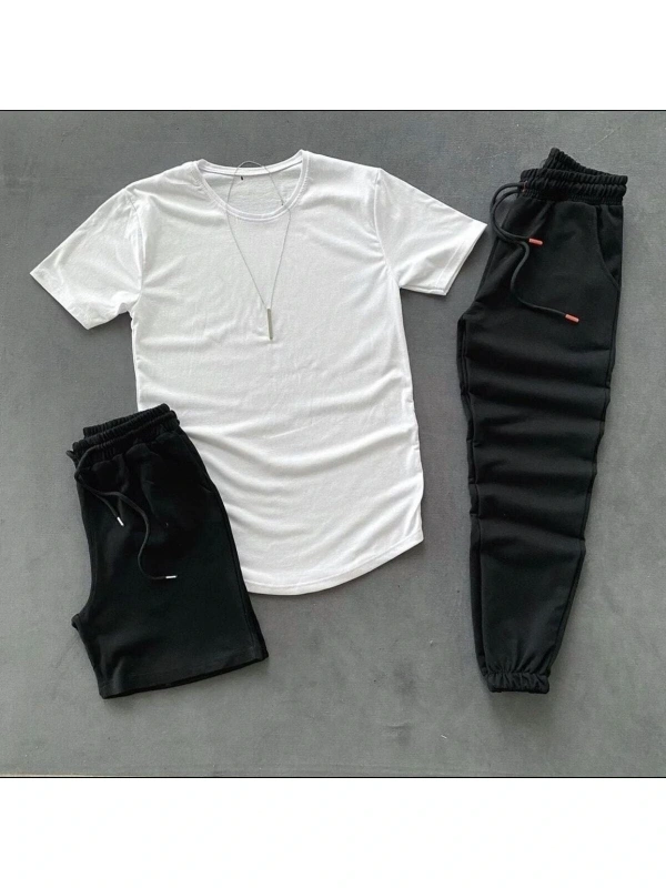 3'lü Siyah Beyaz Eşofman Takımı T-shirt Şort Eşofman Altı Kombin Düzjozatakım