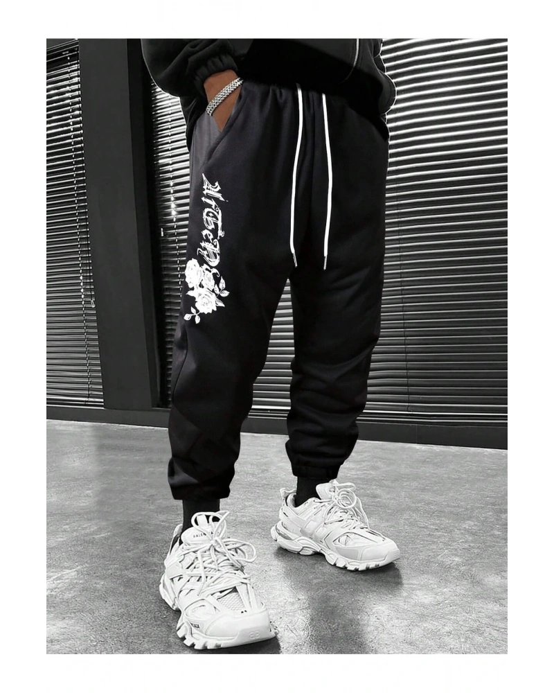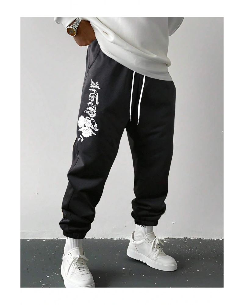 Guys Japanese Letter & Floral Print Drawstring Waist Eşofman Altı