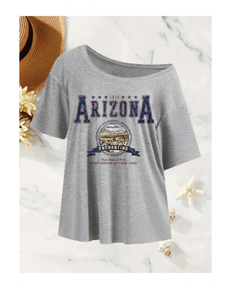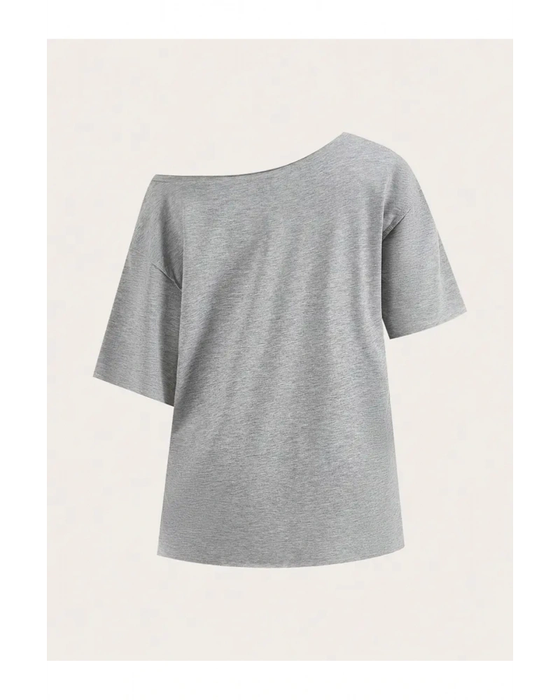 Gri Kadın Düşük Omuz Kayık Yaka Baskılı