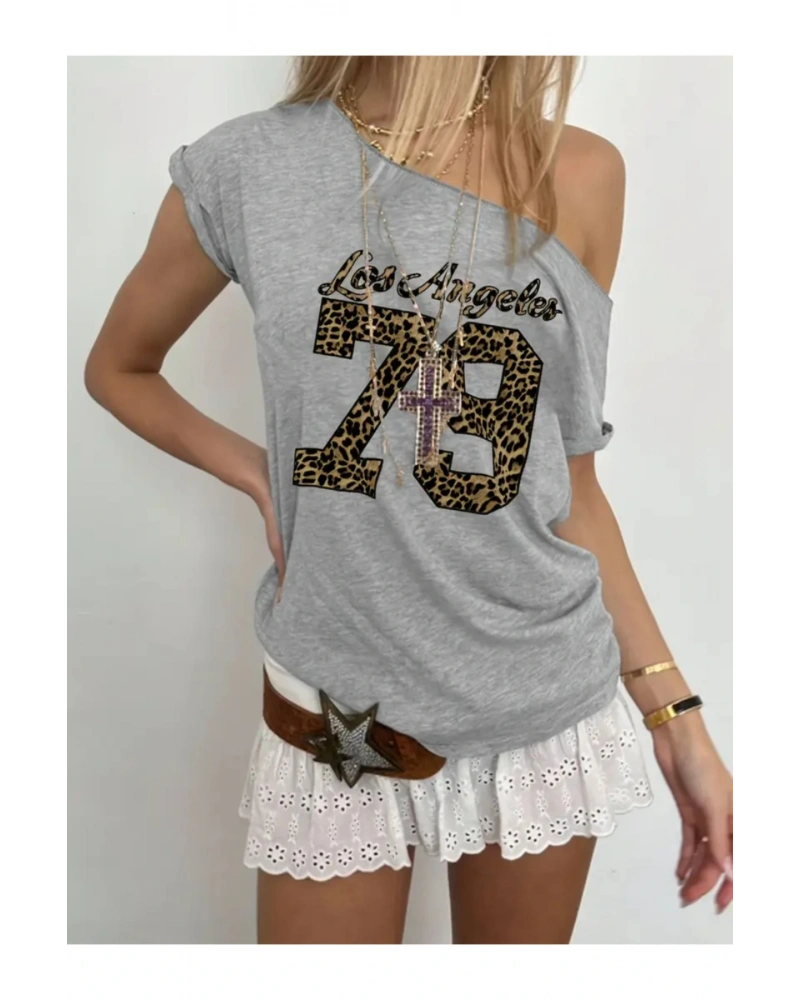 Gri Kadın Düşük Omuz Kayık Yaka Leopar 79 Baskılı
