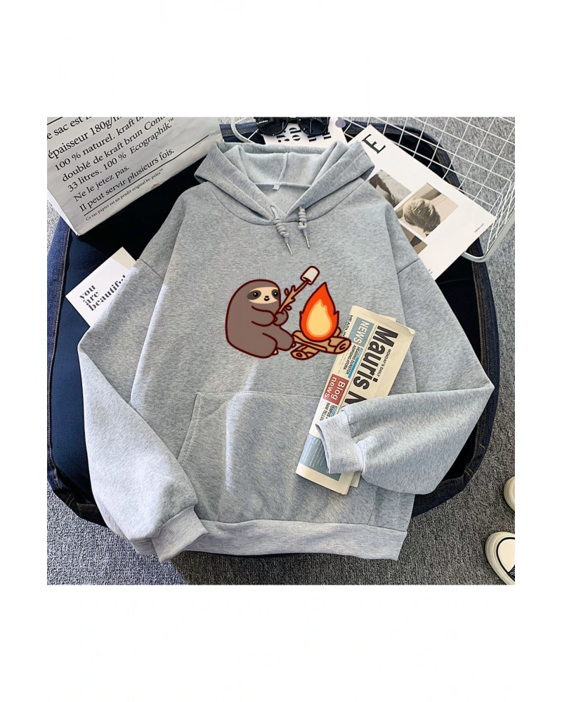 Gri Tembellik Kawaii Sokak Bisiklet Yaka Ayı Baskılı Kapş