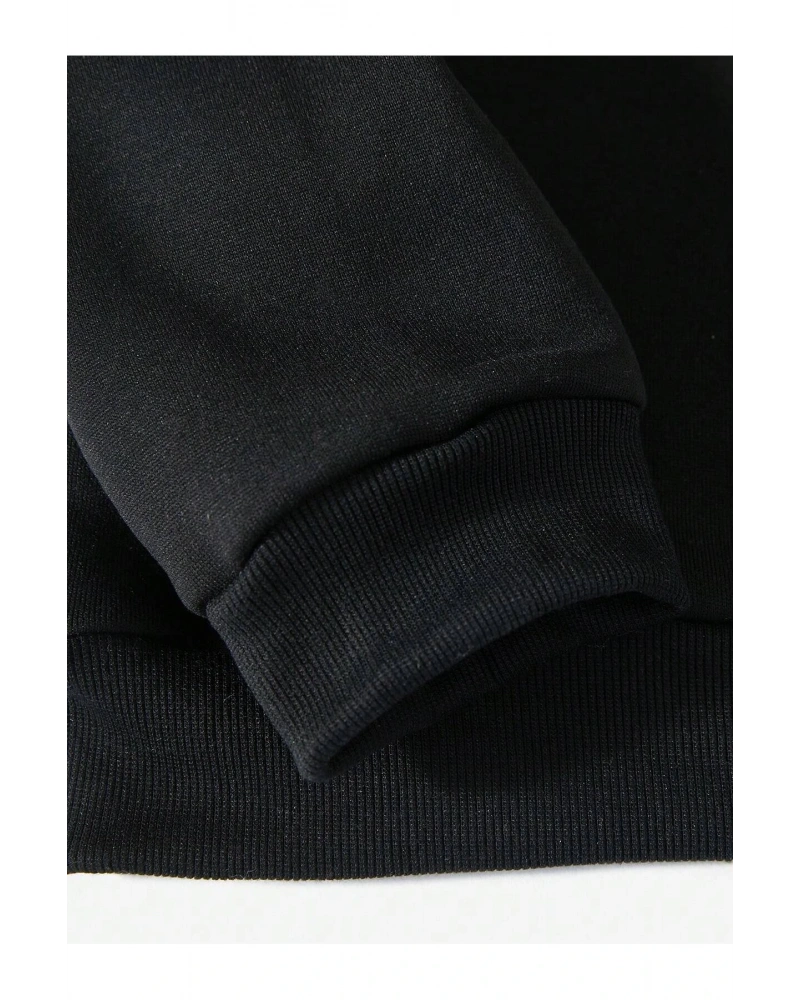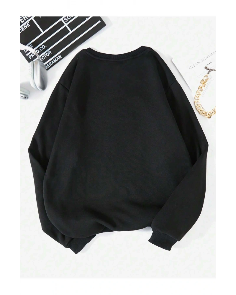 Siyah Yakasız Tüy Baskılı Unisex Sweatshirt