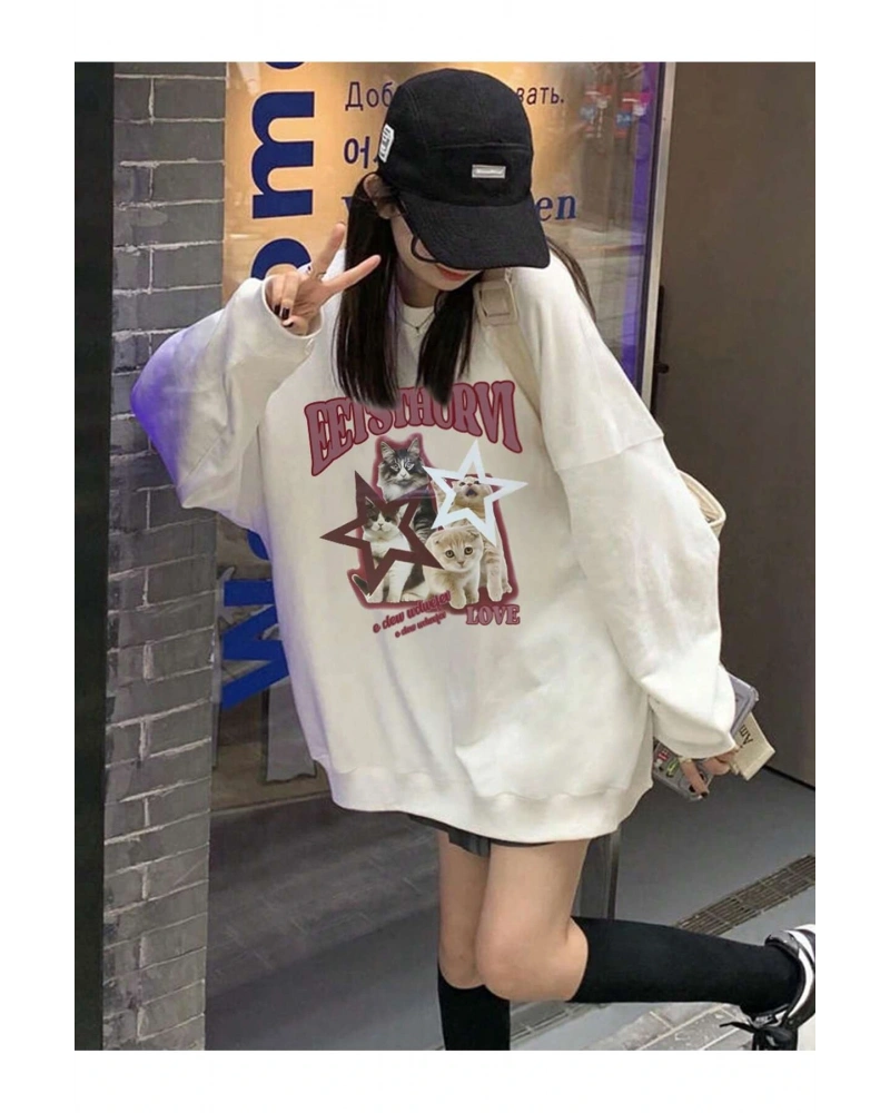 Sloganlı ve Yıldız Desenli Düşük Omuzlu Oversize Sweat Bej