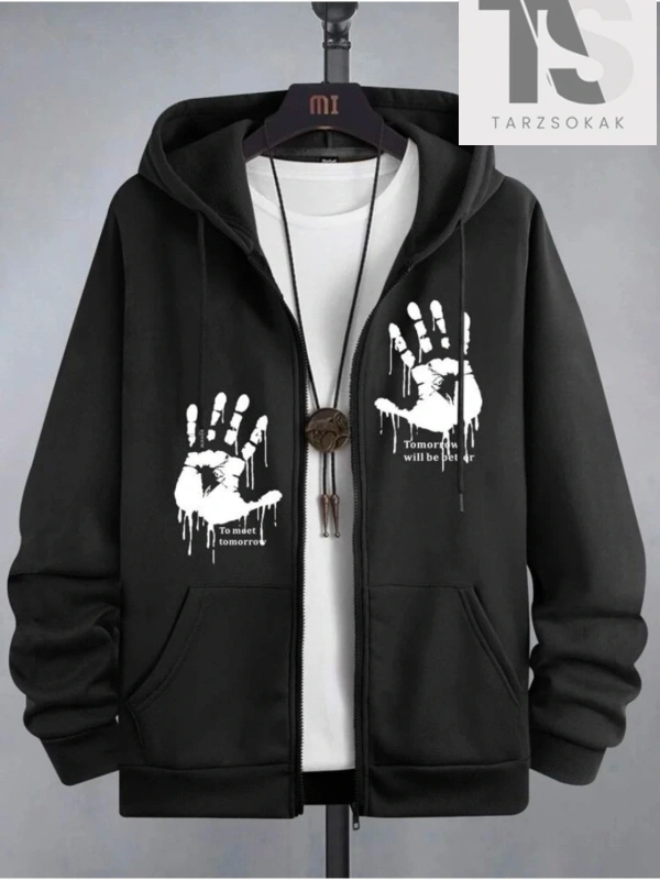 Kapüşonlu Unisex Siyah El Baskılı Fermuarlı