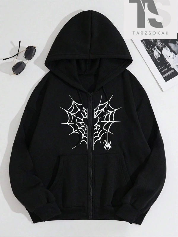 Büyük Beden Örümcek Ağı Silver Baskılı Kapüşonlu Fermuarlı Oversize Kadın Ceket-swe Siyah