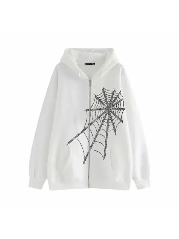 Büyük Beden Kapüşonlu Farmuarlı Silver Örümcek Ağı Baskılı Oversize Kadın Ceket Swe Beyaz