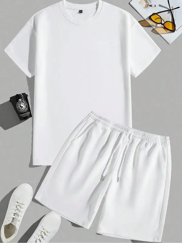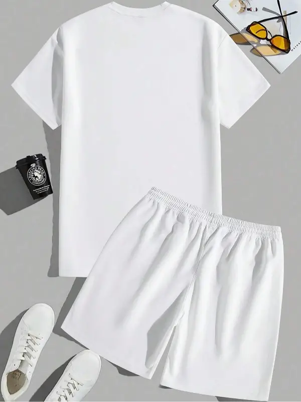 2 adet/takım Erkek Yaz Rahat Spor Düz Renk Mürettebat Tişört ve Şort Takımı