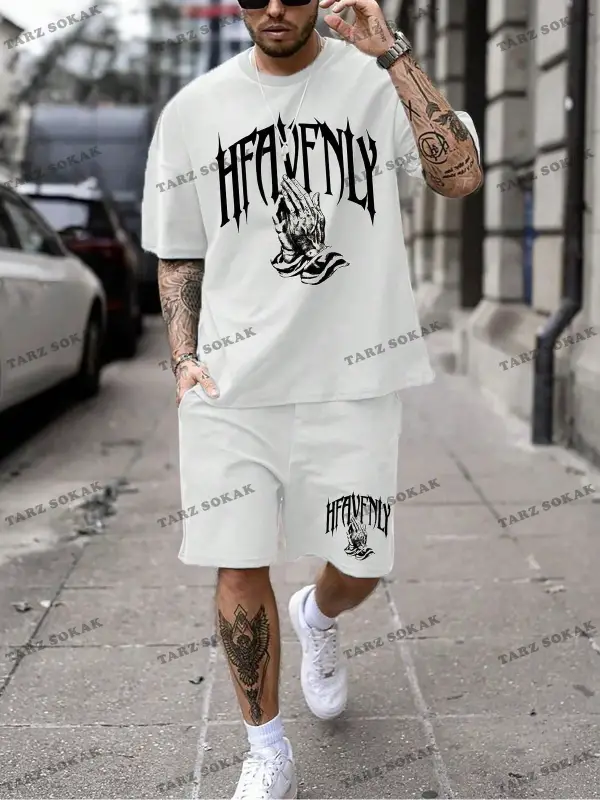 Hypemode Beyaz Örme Erkek Yazılı Baskılı Kısa Kollu Tişört Ve Şort Takım