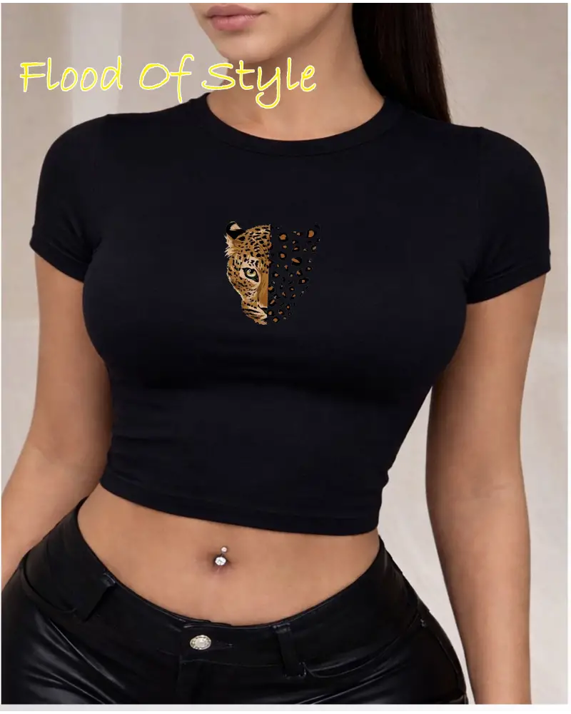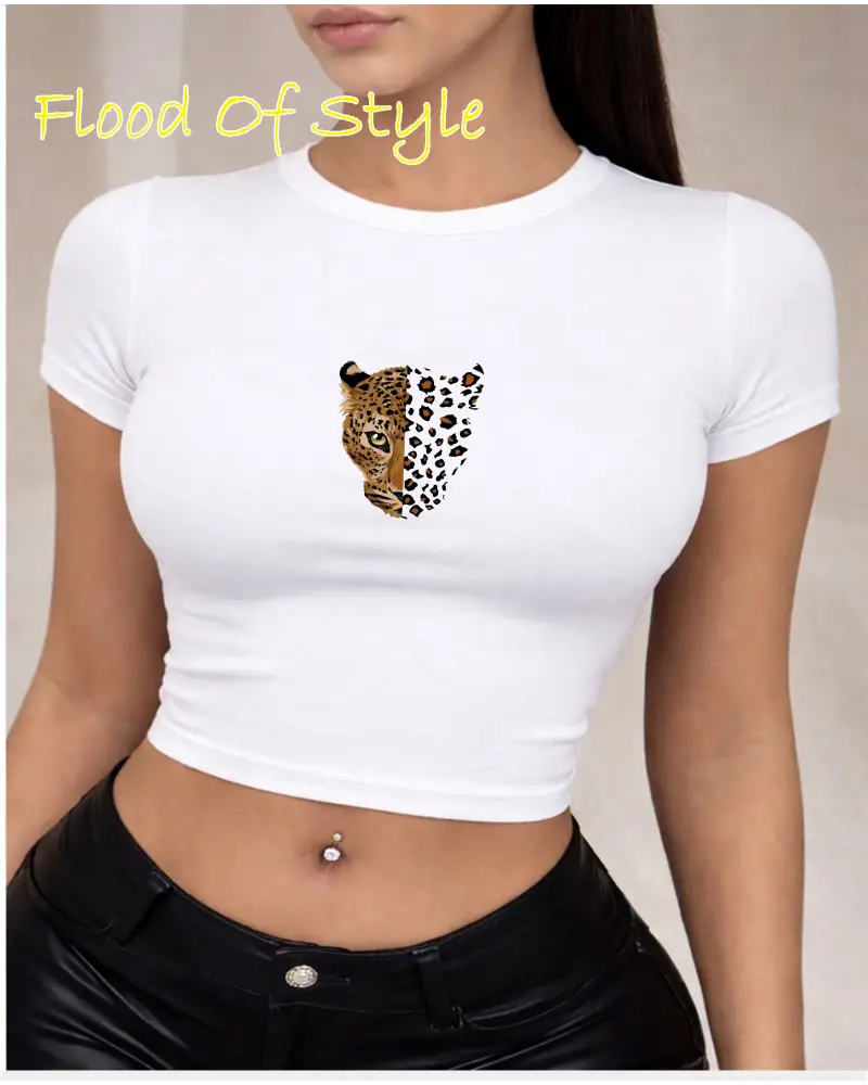 Kelebek Kalp Grafik Baskı Kadın Kırpma T-Shirt Yaz Yüksek Elastik O-Boyun Üstleri Seksi Ince