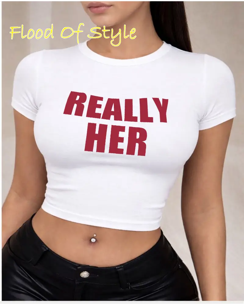 Kırmızı Kalp Grafik Baskılı Bayan Kırpma Tişörtleri Yaz Yüksek Elastik O-Boyun Üstleri Sokak