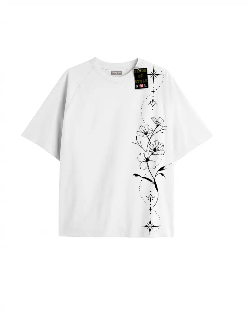 Beyaz Oversize T-shirt gül yaprak dal Özel tasarım