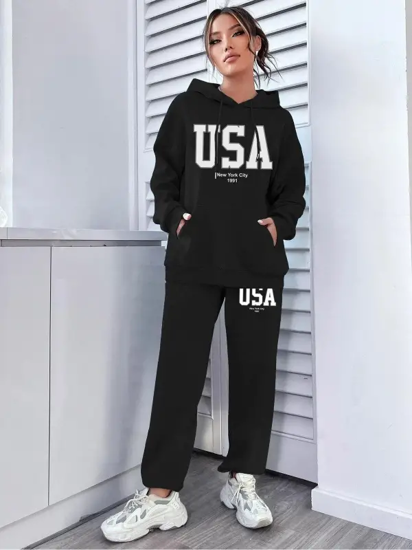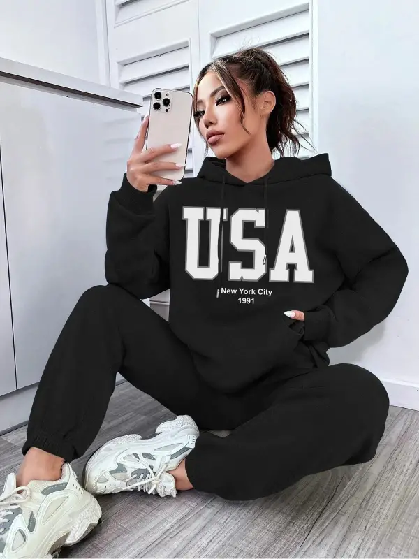Siyah Usa Dijital Baskılı Kışlık UNİSEX Eşofman Takımı