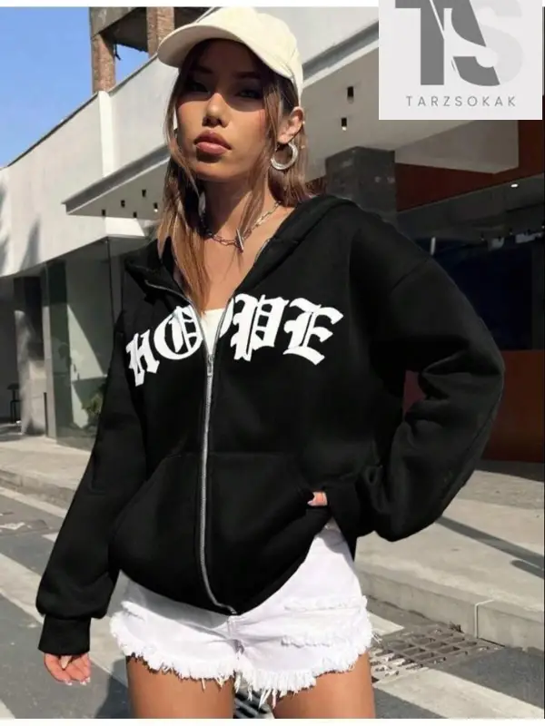 Kadın Hope Baskılı Fermuarlı Kapşonlu Oversize Siyah