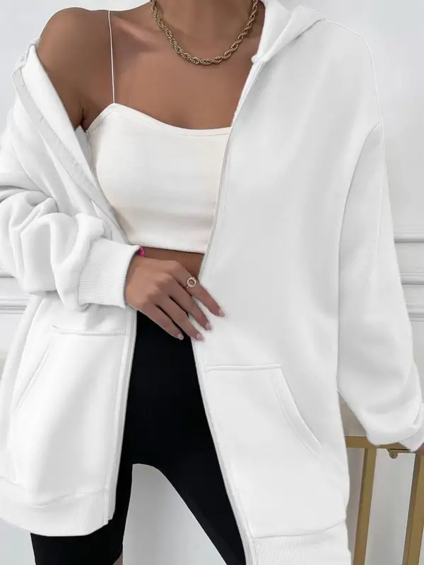 Kadin Ekru Kapüşonlu Fermuarlı 3 Üç Iplik Polar Kanguru Oversize Salaş Sweatshirt Beyaz