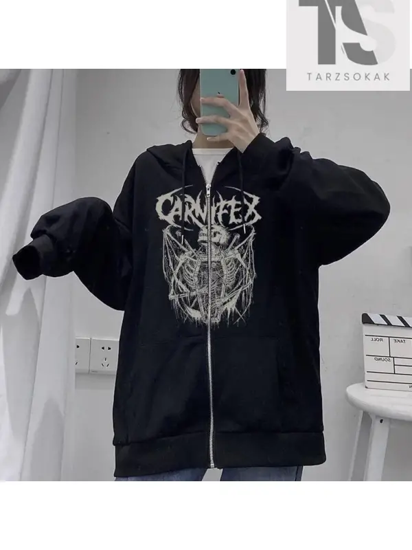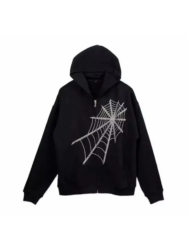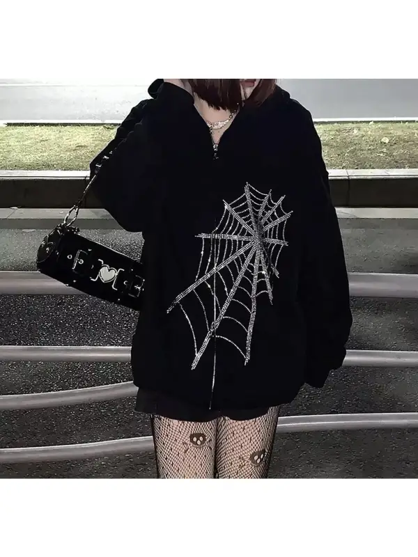Büyük Beden Örümcek Ağı Silver Baskılı Kapüşonlu Fermuarlı Oversize Kadın Ceket-swe Siyah