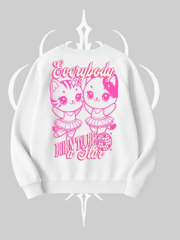 Born to Be a Star Yazılı Sevimli Kedi Arka Baskılı Biskilet Sweatshirt