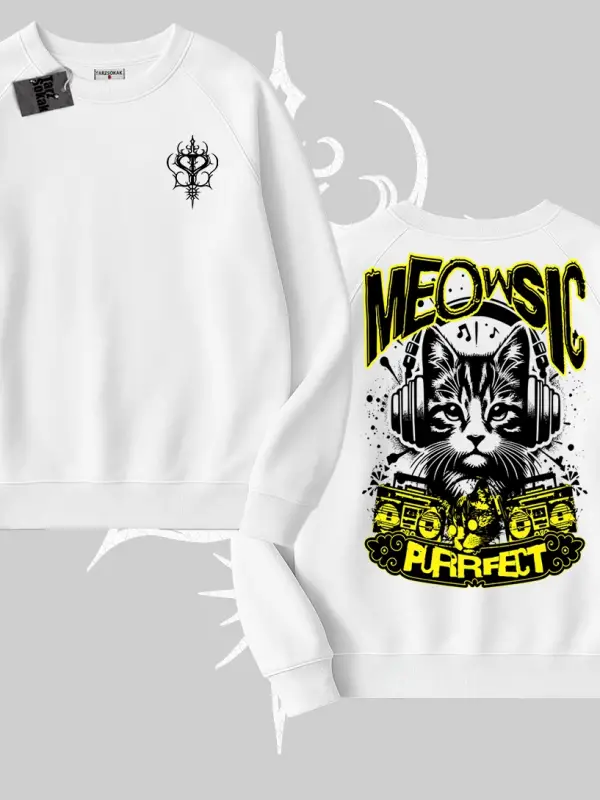 Meowsic Purrfect Kedi Arka Baskılı Biskilet Sweatshirt