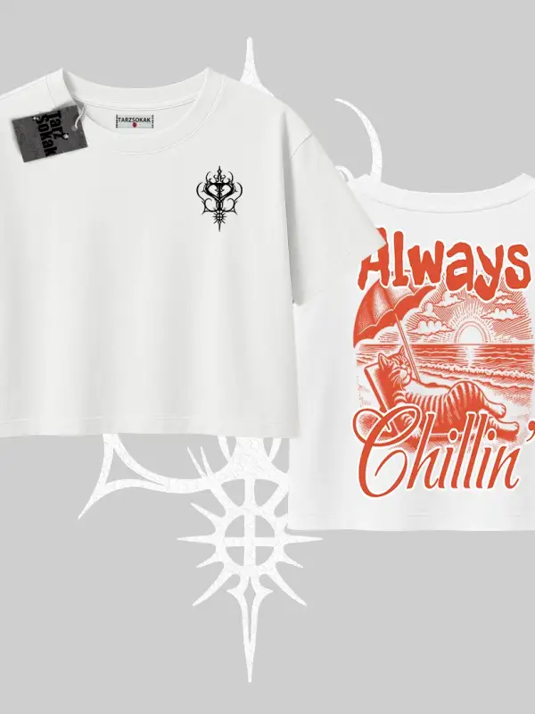 Always Chillin Kedi Arka Baskılı Oversize Crop Tshirt