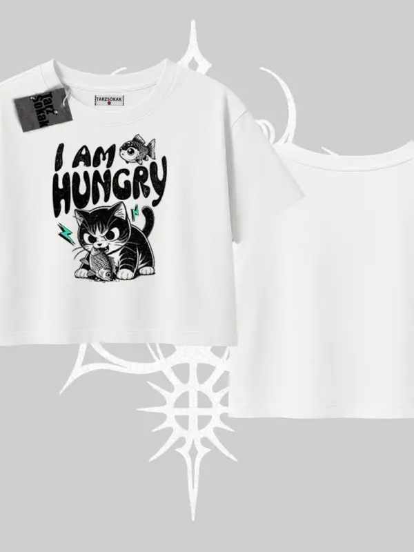 Am Hungry Kedi Baskılı Oversize Crop Tshirt