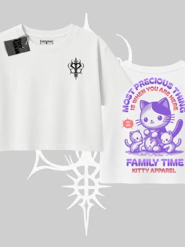 Family Time Yazılı Sevimli Anne Kedi Arka Baskılı Oversize Crop Tshirt