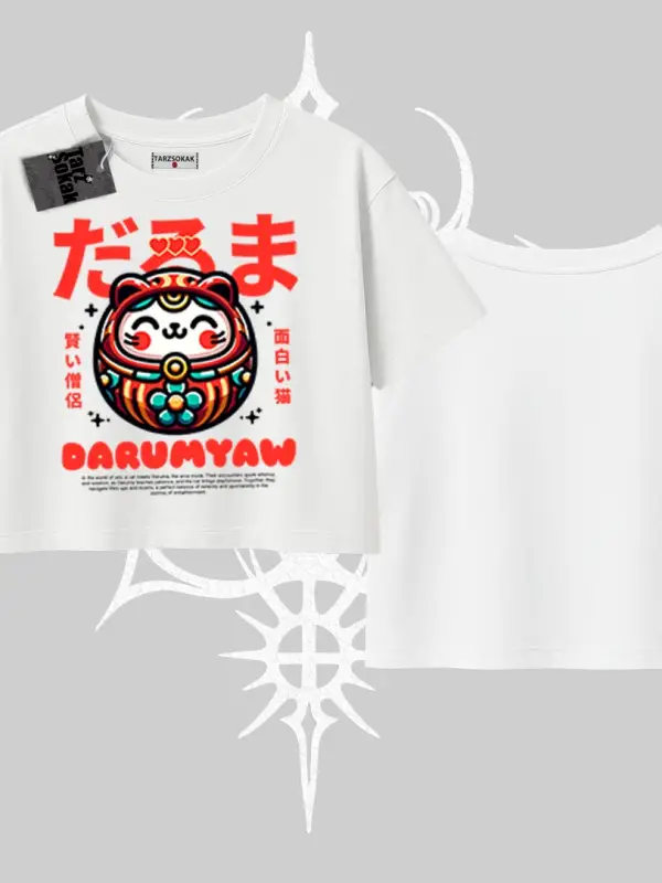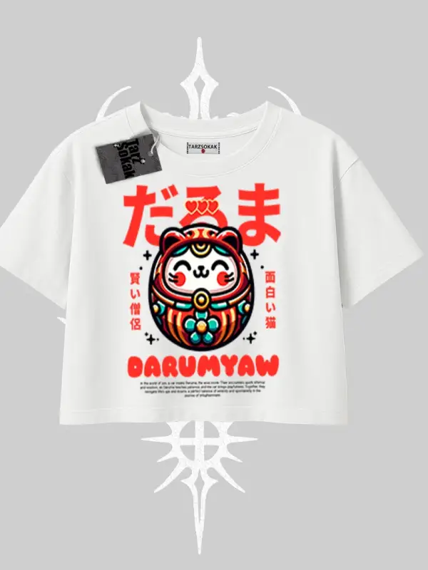 Oversize Crop Tshirt Daruma Kedi Anime Baskılı