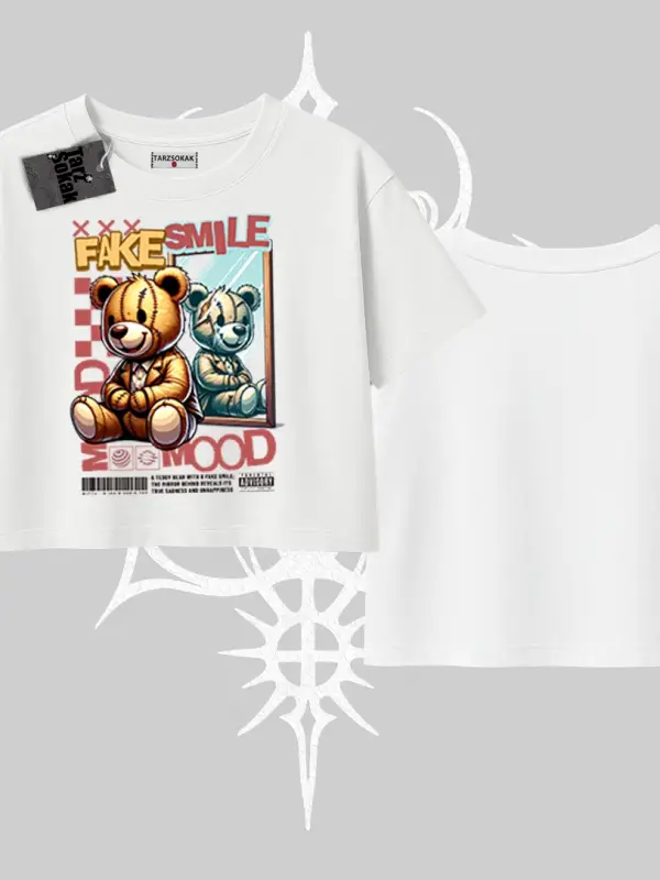 Oversize Crop Tshirt Fake Smile Mood Ayıcık Grafik Baskılı