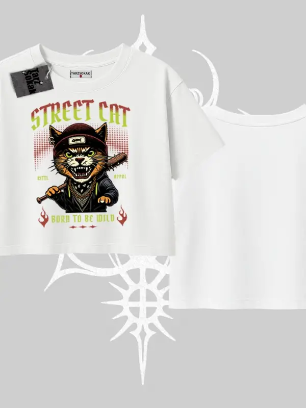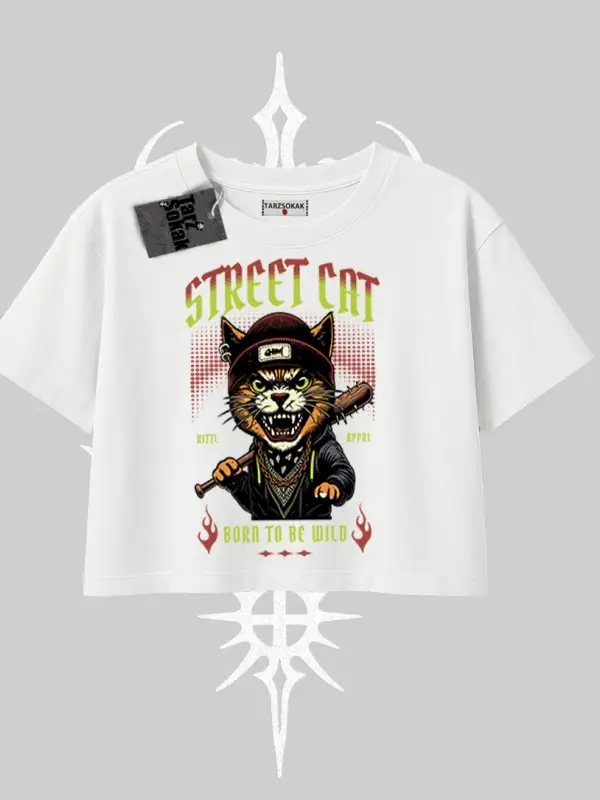 Street Cat Kedi Baskılı Oversize Crop Tshirt