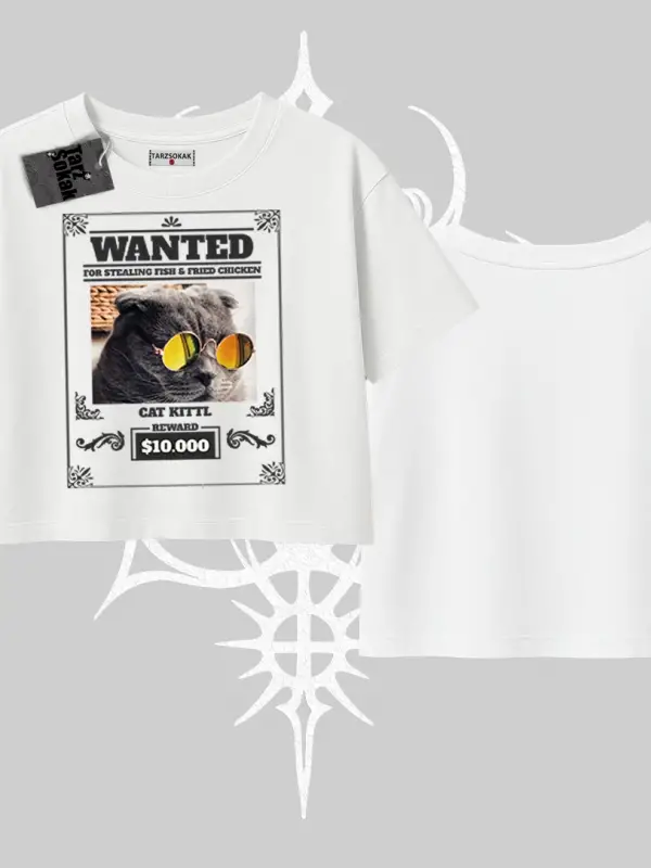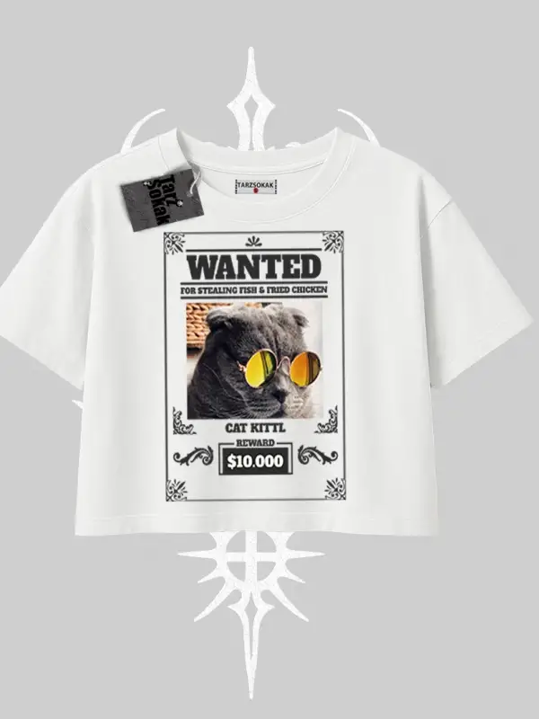 Wanted Temalı Kedi Baskılı Oversize Crop Tshirt