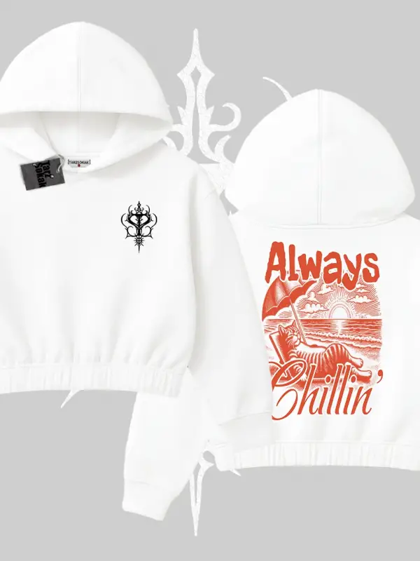 Always Chillin Kedi Arka Baskılı Kapşonlu Crop Sweatshirt