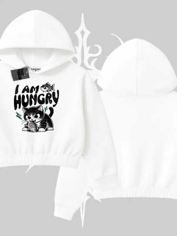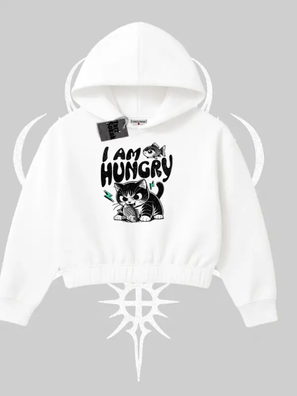 Am Hungry Kedi Baskılı Kapşonlu Crop Sweatshirt