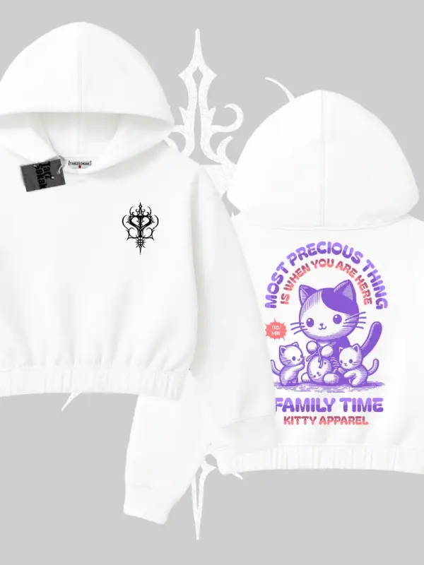 Family Time Yazılı Sevimli Anne Kedi Arka Baskılı Kapşonlu Crop Sweatshirt