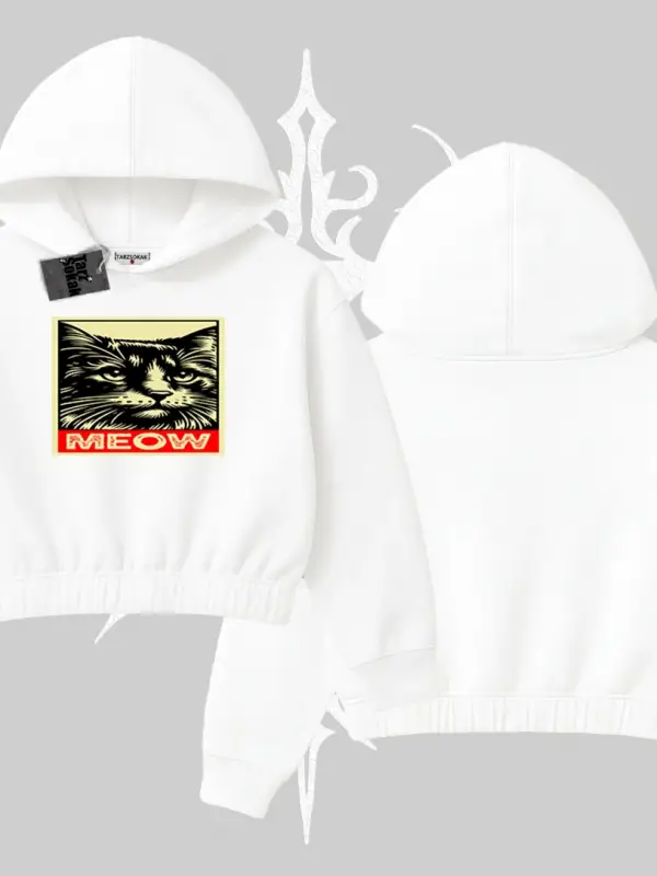 Meow Yazılı Kedi Portre Baskılı Kapşonlu Crop Sweatshirt