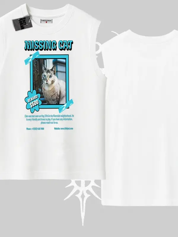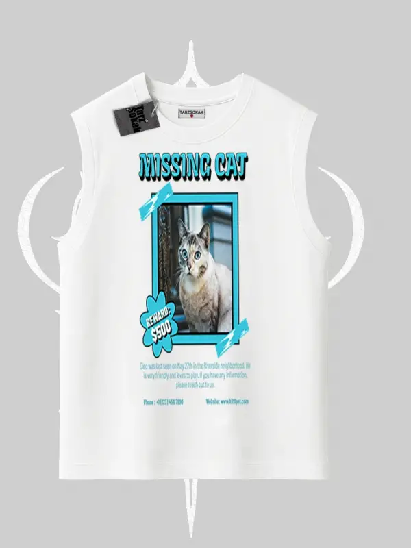 Modern Kedi Temalı Arka Baskılı Kolsuz Tshirt