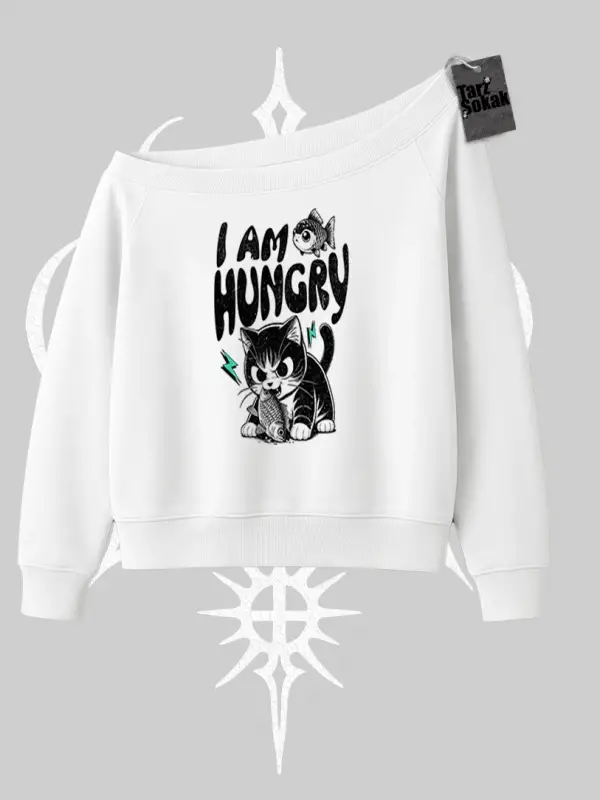 Am Hungry Kedi Baskılı Kayık Yaka Sweatshirt