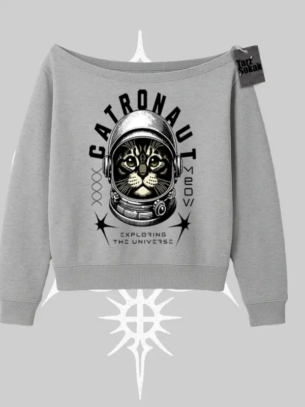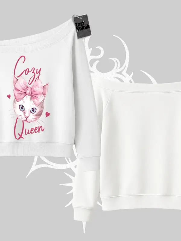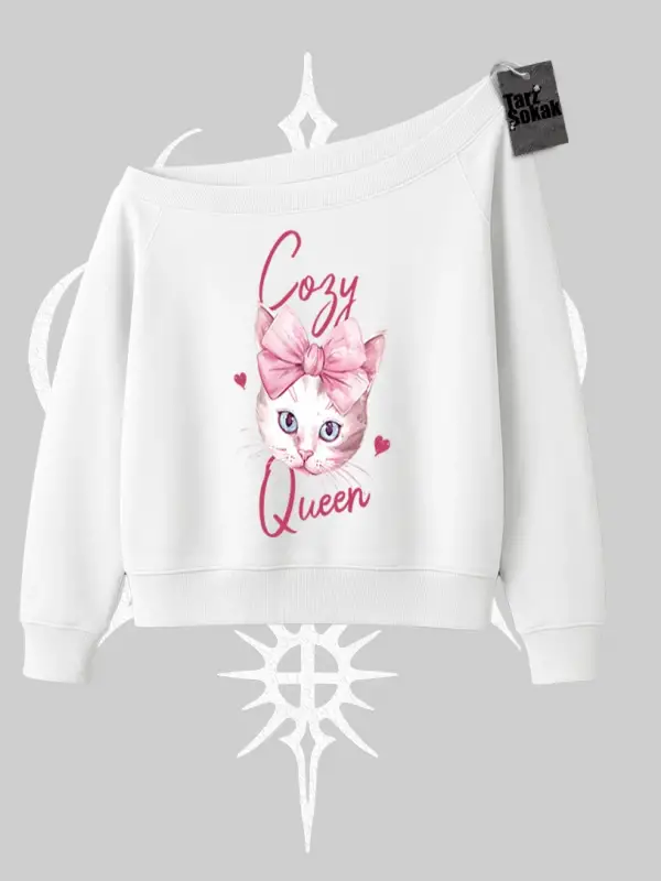 Cozy Queen Kedi Baskılı Kayık Yaka Sweatshirt