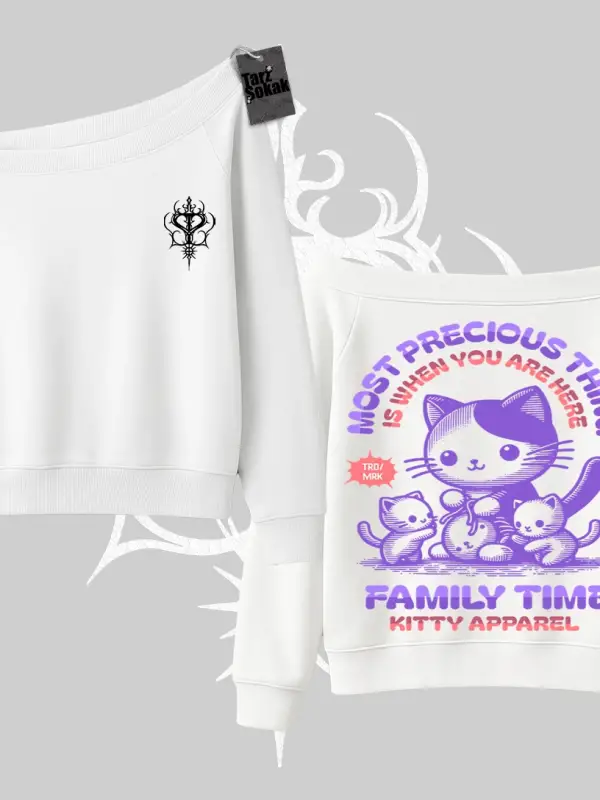 Family Time Yazılı Sevimli Anne Kedi Arka Baskılı Kayık Yaka Sweatshirt
