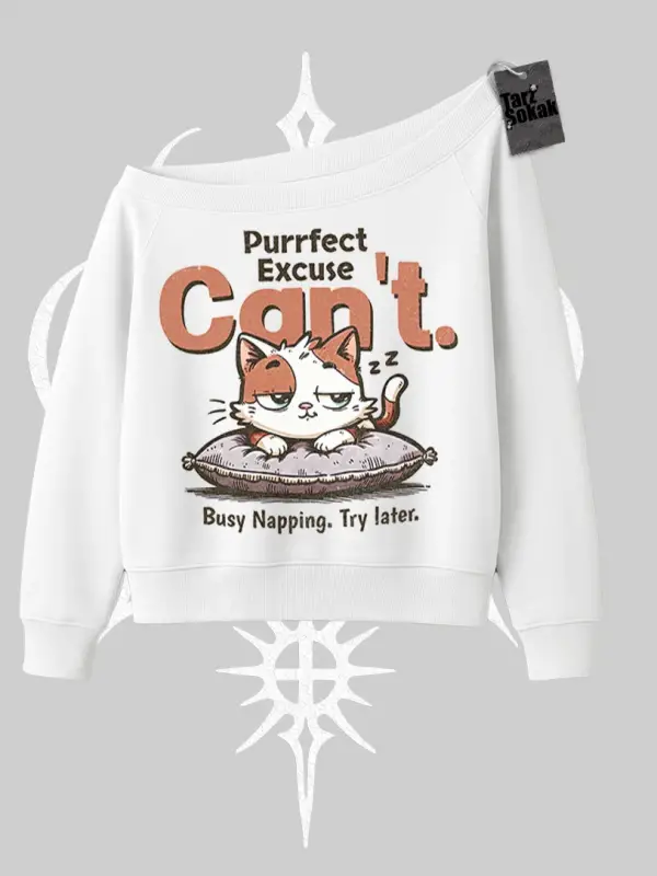 Kedi Baskılı Cant Busy Napping Y2K Kayık Yaka Sweatshirt