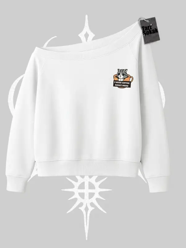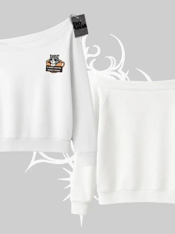 Need Coffee Right Meow Yazılı Kedi Baskılı Kayık Yaka Sweatshirt
