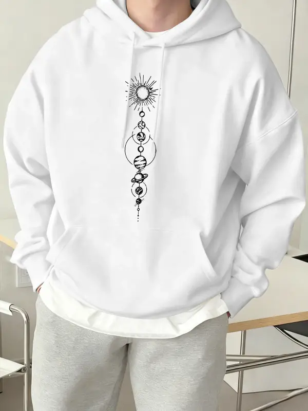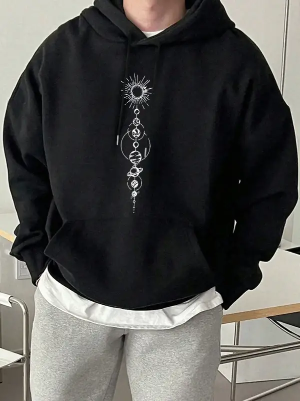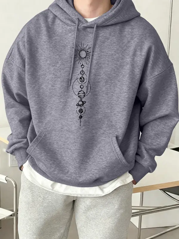 Planet Basitleştirilmiş Diyagram Baskılı Erkek Polar Kapüşonlu Cepli Rahat Sokak Giysisi Soka