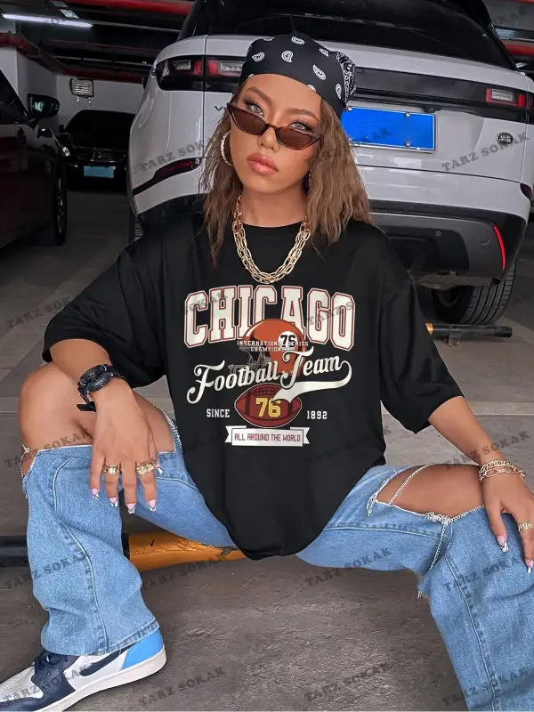 Unisex BAY Rugby ve Slogan Grafikli Düşük Omuzlu Oversize Tişört KOD-1389