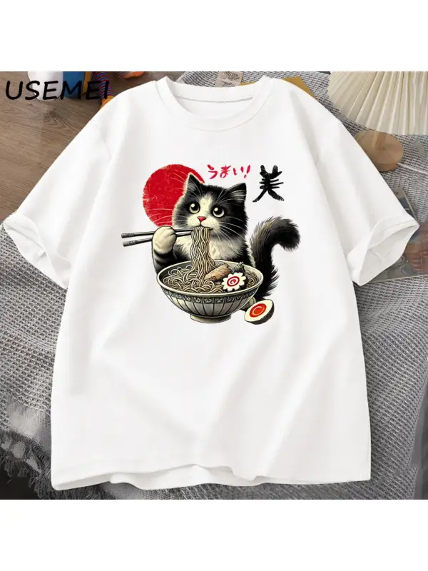 Ramen Kedi Tshirt Japon Tarzı Kedi Sevgilisi T-Shirt Kawaii Karikatür Pamuk Kısa Kollu T Shir 2863