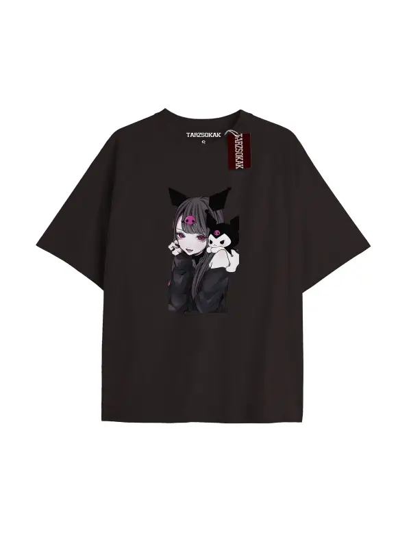 Sef Kedi Renkli Oversize Bisiklet Yaka Pamuklu Sweatshirt Siyah