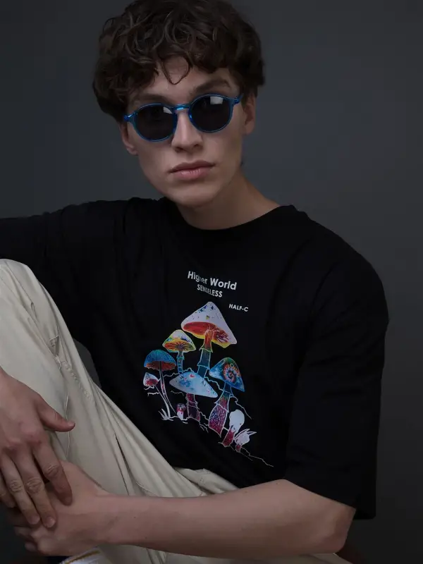 Erkek Siyah Polizai Baskılı Oversize Bisiklet Yaka Tişört